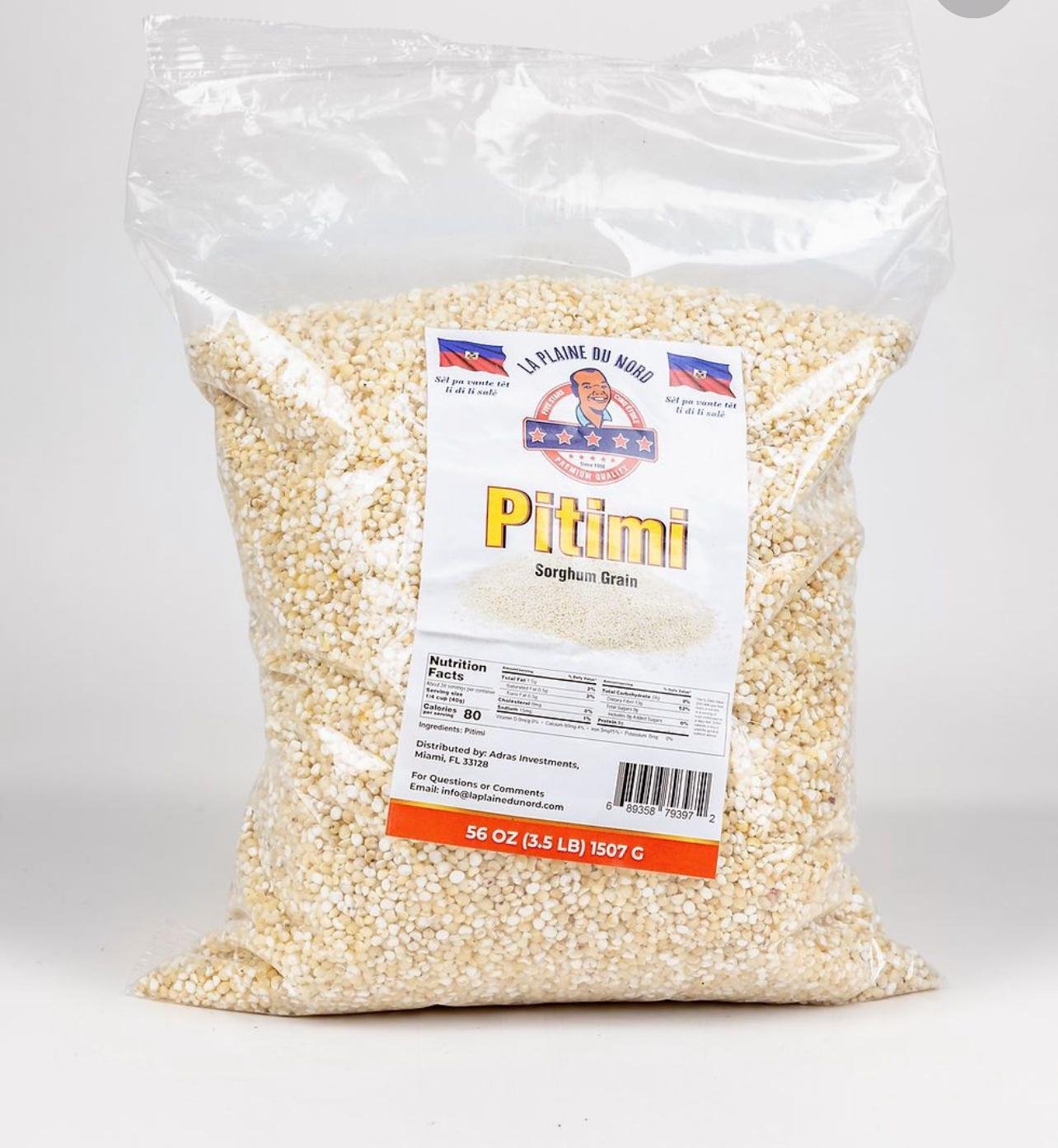 - Brand: La Plaine Du Nord, Product Name: Pitimi – Sorghum Grain, Net Weight: 56 oz (3.5 lb / 1507 g), Packaging: Clear plastic bag with colorful label featuring Haitian flags and cultural symbols, Distributor: Adna Investment, Contact: adnainvestment@gmail.com, Serving Size: 1/4 cup (45 g), Calories per Serving: 80