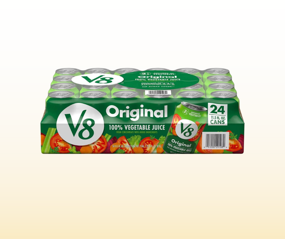 - V8, Original 100% Vegetable Juice from concentrate with added ingredients,24 cans 11.5 fl oz (340 mL) per can2 servings of vegetables per can, No sugar added, Rich in vitamins A and C, low in calories, and cholesterol-free